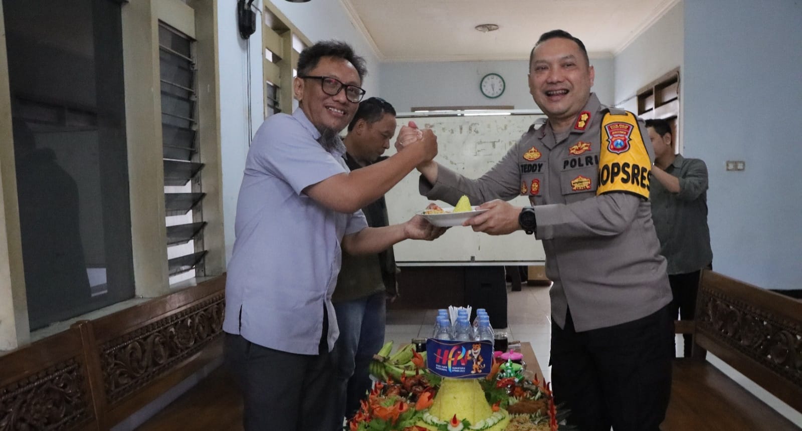 Kejutan yang dibawa Kapolres Kediri Kota adalah tumpeng lengkap dengan lauk pauknya, sebagai ucapan selamat Hari Pers Nasional (HPN) ke -77 kepada insan Pers yang tergabung dalam PWI Kediri.