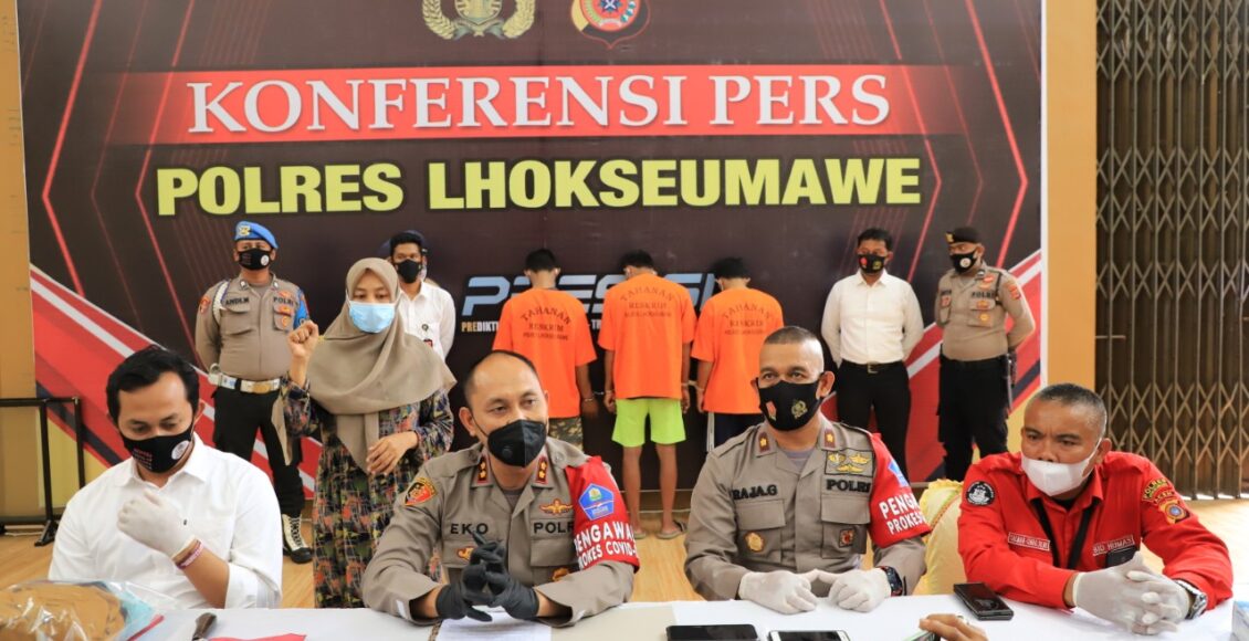 Kapolres Lhokseumawe AKBP Eko Hartanto SIK MH dalam konferensi pers di gedung serbaguna Wira Satya Mapolres Lhokseumawe, Senin (30/8/2021) kepada sejumlah awak media mengatakan, ke tiga tersangka ini berinisial, DS (37), S (25) dan MFI (26) warga Kecamatan Banda Sakti, Kota Lhokseumawe. Penangkapan tersebut berdasarkan Laporan Polisi (LP) 292/VIII/2021/Aceh/ Res. Lsmw, tanggal 23 Agustus 2021.