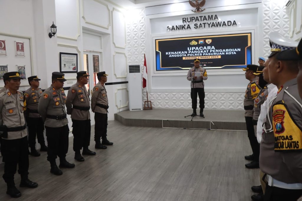 Dalam pelaksanaan Upacara kenaikan pangkat Periode TMT 1 Maret 2024 personil Polres Pasuruan Kota di pimpin oleh Kapolres Pasuruan Kota selaku Irup dengan di ikuti oleh Wakapolres Pasuruan Kota, PJU dan personil Polres Pasuruan Kota yang melaksanakan kenaikan pangkat.