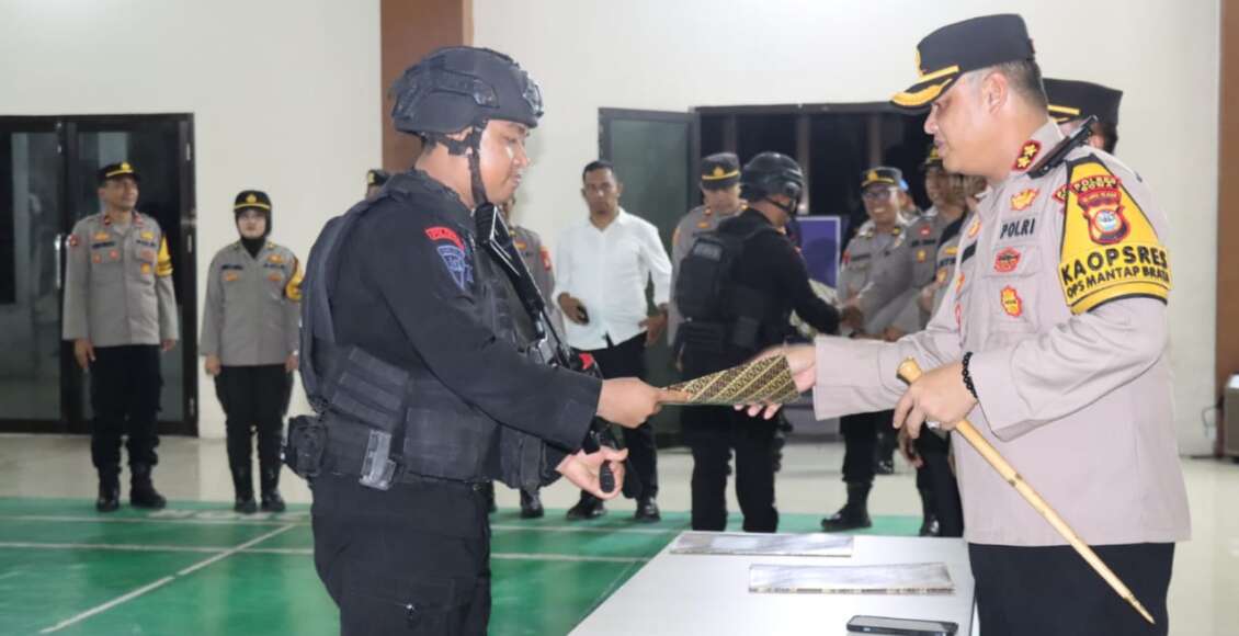 Setelah melepas sebanyak 80 personel BKO Brimob Polda Sulsel yang telah bertugas di Polres Gowa selama pemilu, Kapolres Gowa juga memberikan Sertifikat Penghargaan kepada personel Brimob tersebut.(Humas Polres Gowa)