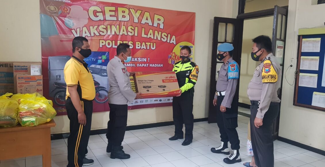 Batu,ikagawanews.id – Kapolres Batu AKBP I Nyoman Yogi Hermawan melaksanakan kegiatan pembagian Doorprize Gebyar Vaksinasi Lansia Polres Batu di Polsek Batu dan Bumiaji, Kota Batu, Sabtu (22/1/2022) sore.