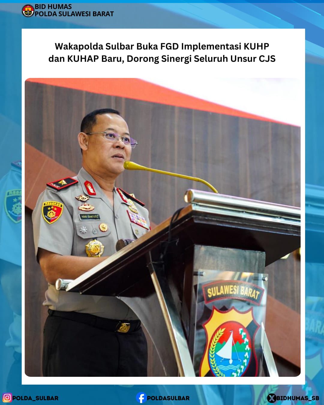 SULBAR,ikagawanews.id – Wakapolda Sulbar Brigjen Pol. Hari Santoso, S.I.K., M.Si. secara resmi membuka kegiatan Focus Group Discussion (FGD) dalam rangka membahas, menyelaraskan dan menyamakan persepsi implementasi KUHP dan KUHAP baru bersama Polisi, Jaksa dan Hakim, Senin (26/1/26) di Aula Marannu Polda Sulbar.