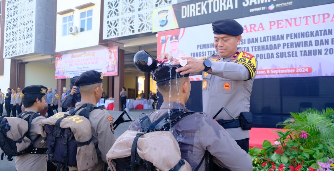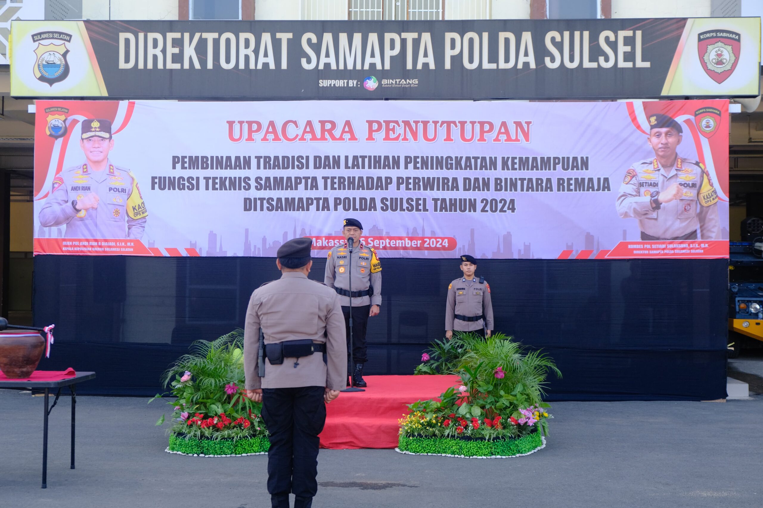 SULSEL,ikagawanews.idWakapolda Sulawesi Selatan, Brigjen Pol Nasri, S.I.K., M.H., memimpin upacara penutupan pembinaan tradisi dan latihan peningkatan kemampuan fungsi teknis Samapta terhadap Perwira dan Bintara Remaja Ditsamapta Polda Sulsel, Jumat (06/09/2024), bertempat di Mako Ditsamapta Polda Sulsel.