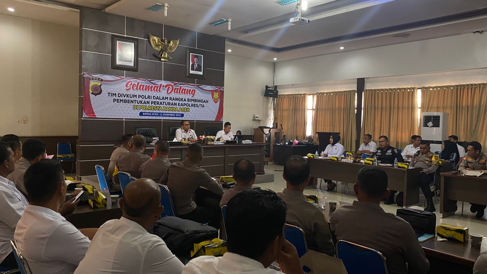 Acara ini menghadirkan narasumber dari Divisi Hukum Polri, di antaranya Kombes Pol. M.B. Pranatal Hutajulu, AKBP Abdul Aziz Septiadi, dan Kompol Teguh Setiawan. Peserta kegiatan meliputi 11 Wakapolres dan Kasikum dari jajaran Polda Aceh, serta pejabat utama Polresta Banda Aceh.