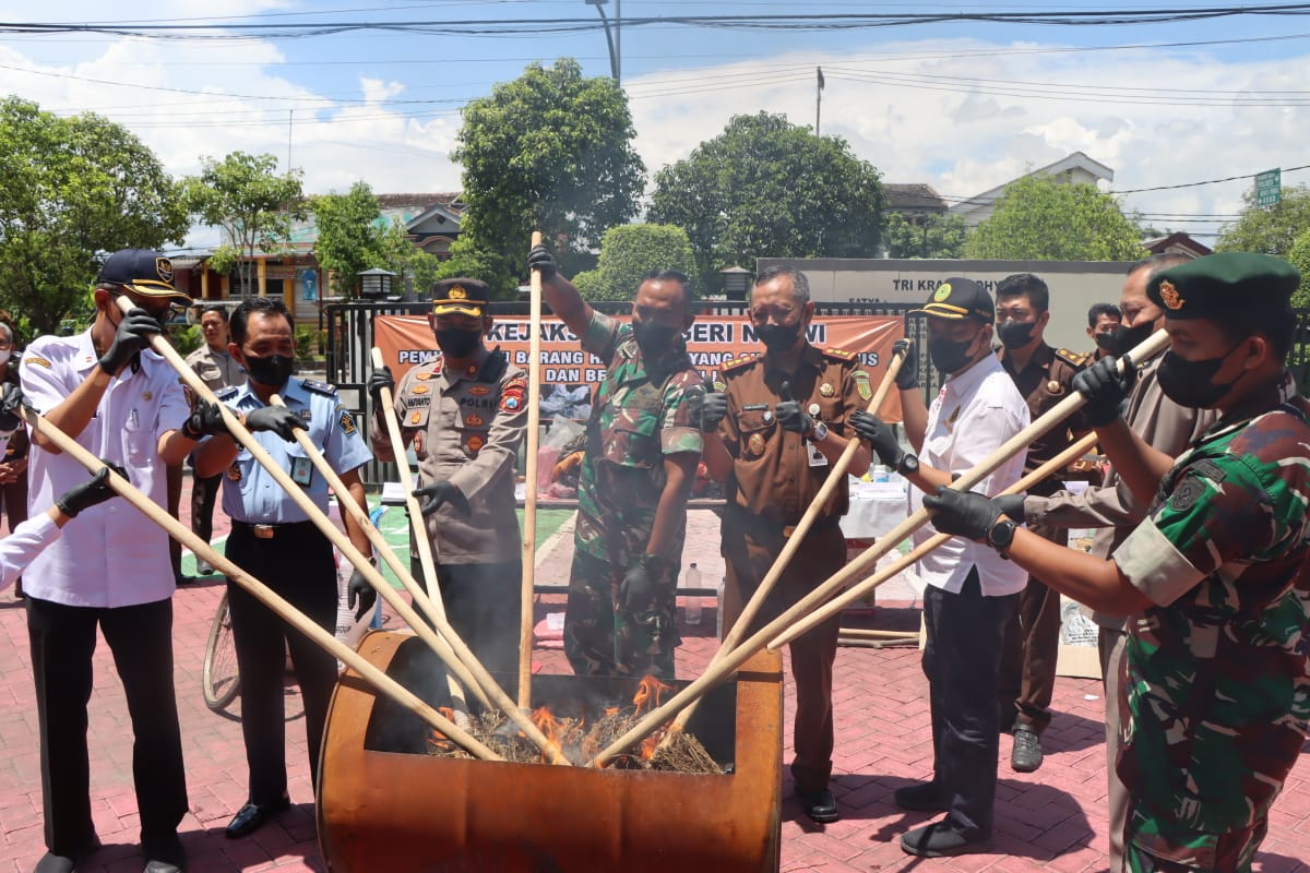 Barang bukti yang dimusnahkan pada hari ini berasal dari 93 Perkara yang terdiri dari perkara narkotika, ganja, obat/ pil koplo, kekerasan, pencabulan, pencurian, kehutanan, penggelapan, penipuan dan tindak pidana korupsi.
