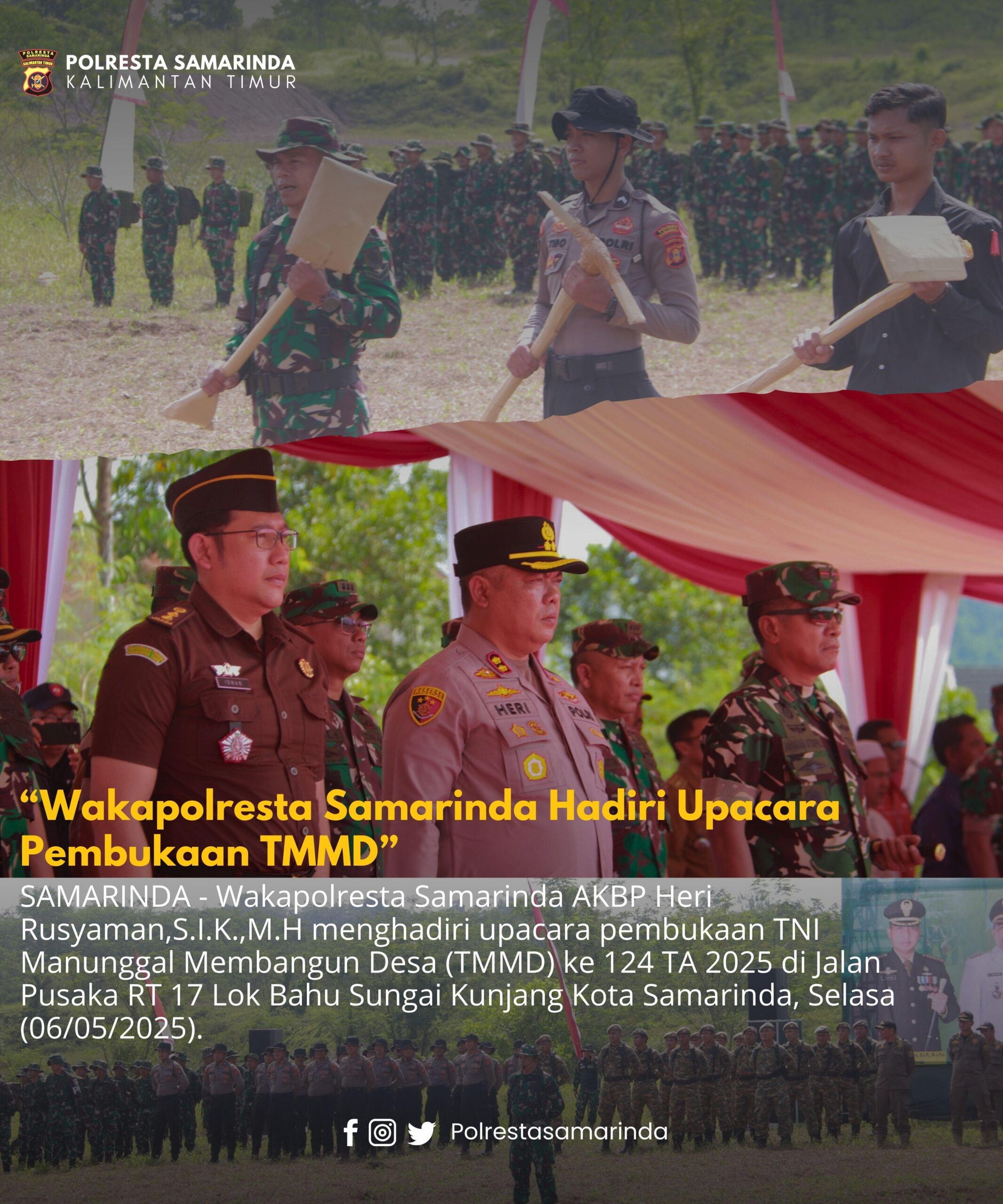 SAMARINDA,ikagawanews.id – Wakapolresta Samarinda AKBP Heri Rusyaman,S.I.K.,M.H menghadiri upacara pembukaan TNI Manunggal Membangun Desa (TMMD) ke 124 TA 2025 di Jalan Pusaka RT 17 Lok Bahu Sungai Kunjang Kota Samarinda, Selasa (06/05/2025).