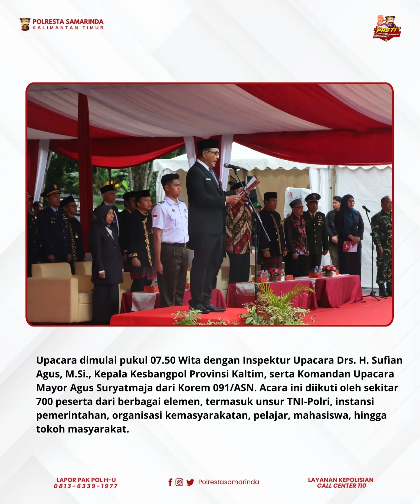 SAMARINDA,ikagawanews.id – Pemerintah Provinsi Kalimantan Timur menggelar Upacara Peringatan Hari Lahir Pancasila Tahun 2025 dengan tema “Memperkokoh Ideologi Pancasila Menuju Indonesia Raya” pada Minggu pagi (1/6/2025) di Halaman Parkir Gelora Kadrie Oening, Jl. Wahid Hasyim, Kelurahan Sempaja Selatan, Kecamatan Samarinda Utara, Kota Samarinda.Upacara dimulai pukul 07.50 Wita dengan Inspektur Upacara Drs. H. Sufian Agus, M.Si., Kepala Kesbangpol Provinsi Kaltim, serta Komandan Upacara Mayor Agus Suryatmaja dari Korem 091/ASN. Acara ini diikuti oleh sekitar 700 peserta dari berbagai elemen, termasuk unsur TNI-Polri, instansi pemerintahan, organisasi kemasyarakatan, pelajar, mahasiswa, hingga tokoh masyarakat.