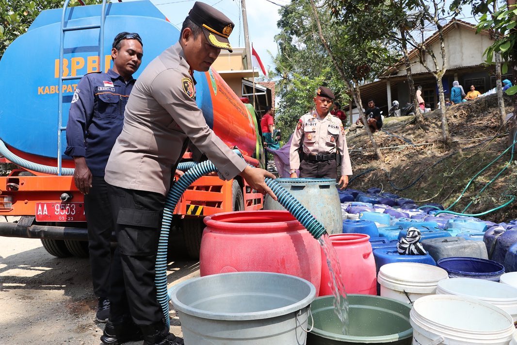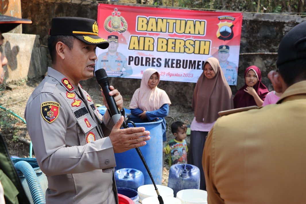 Kapolres Kebumen AKBP Burhanuddin bersama pejabat utama Polres dan Muspika Karanggayam turun langsung saat pendistribusian air bersih.