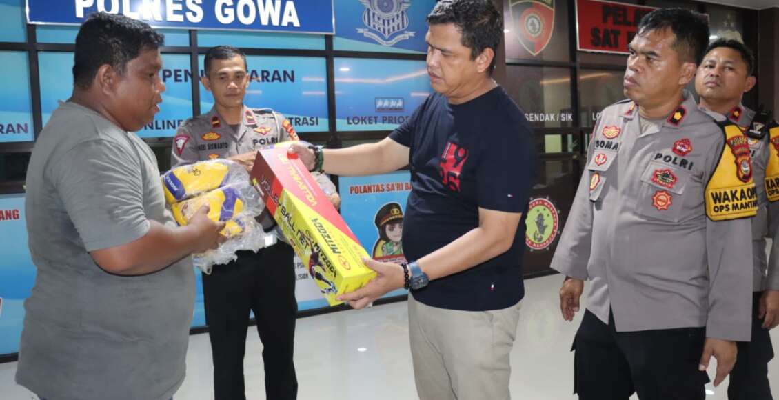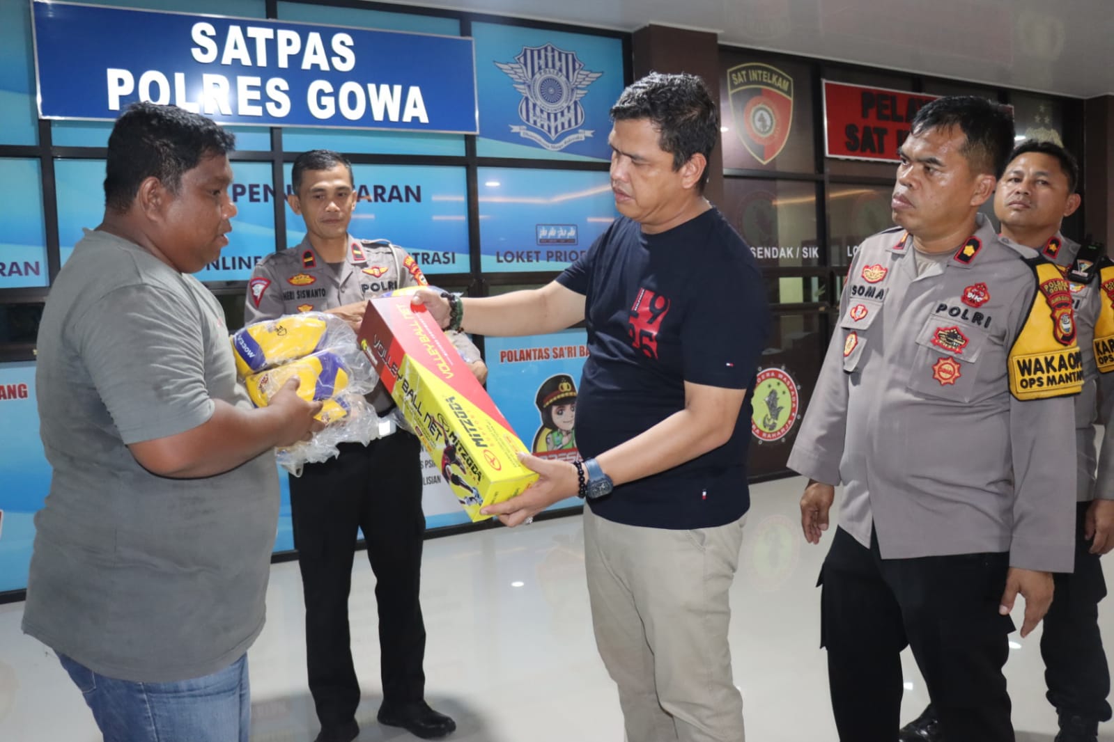 Penyerahan bola voli dan net yang diterima langsung oleh salah seorang pengurus PBVSI Gowa, Yoksan Lopes yang digelar di Gedung Pelayanan Terpadu Polres Gowa, Rabu (21/2) malam.