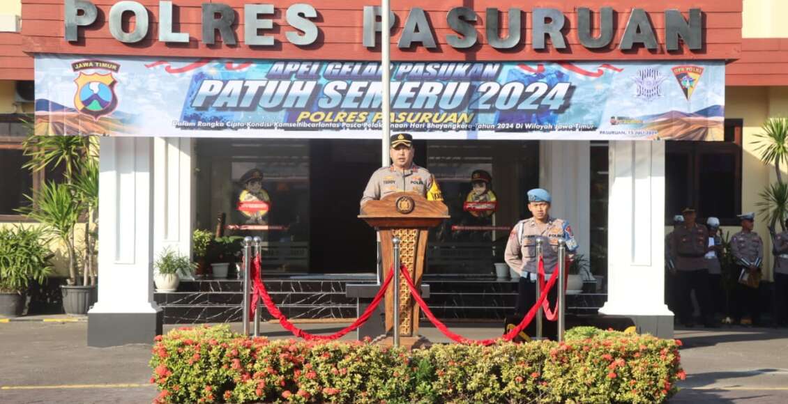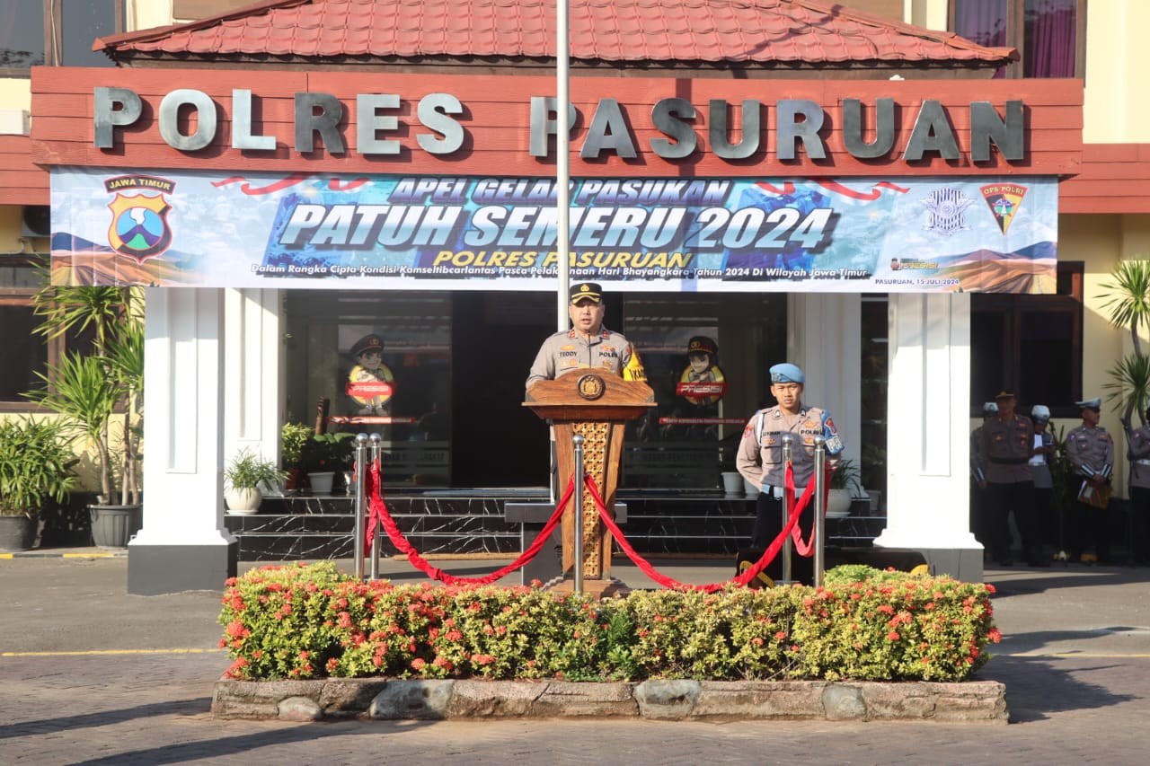 Kapolres Pasuruan AKBP Teddy Chandra, S.I.K., M.Si. dalam sambutannya, ia membacakan amanat dari Kapolda Jatim Irjen Pol. Drs. Imam Sugianto, M.Si. yang isinya, “Polda Jawa Timur beserta seluruh jajaran, dengan dibantu oleh stakeholder terkait, akan melaksanakan Operasi Kepolisian Kewilayahan dengan sandi “Operasi Patuh Semeru 2024”. Operasi ini akan digelar selama 14 hari, mulai tanggal 15 s.d. 28 Juli 2024 di seluruh wilayah Jawa Timur, Adapun tema Operasi ini adalah “Tertib Berlalu Lintas Demi Terwujudnya Indonesia Emas”, Tema tersebut menekankan pentingnya keselamatan dan ketaatan dalam berlalu lintas sebagai bagian dari upaya mencapai kemajuan indonesia,” terang Kapolres.