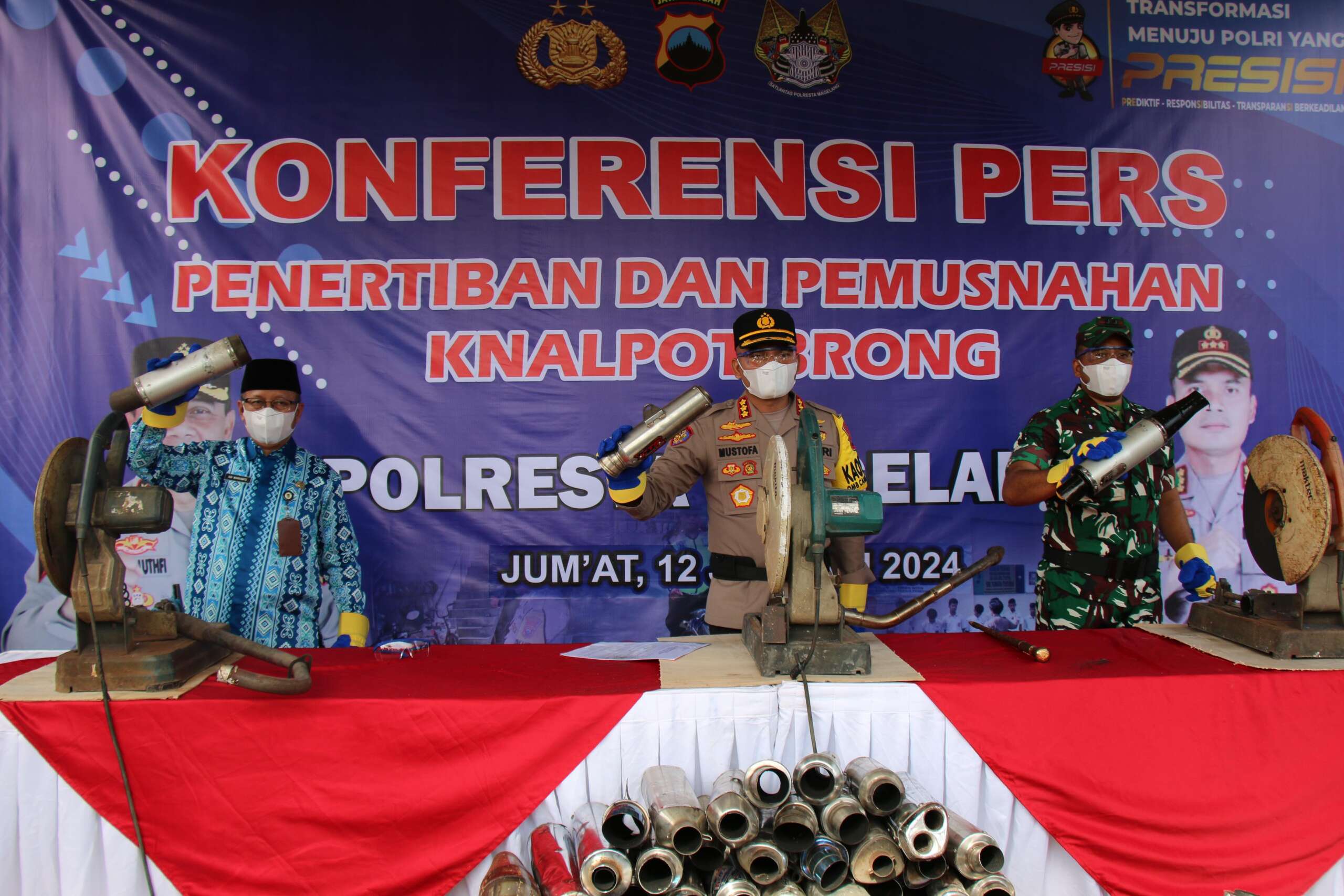 MAGELANG, ikagawanews.id – Dalam rangka mewujudkan Harkamtibmas dan Kamseltibcarlantas di wilayah Kabupaten Magelang, Polresta Magelang melaksanakan Konferensi Pers Penertiban dan Pemusnahan Knalpot Brong di halaman depan Mapolresta Magelang, pada Jumat (12/01/2024) pagi.